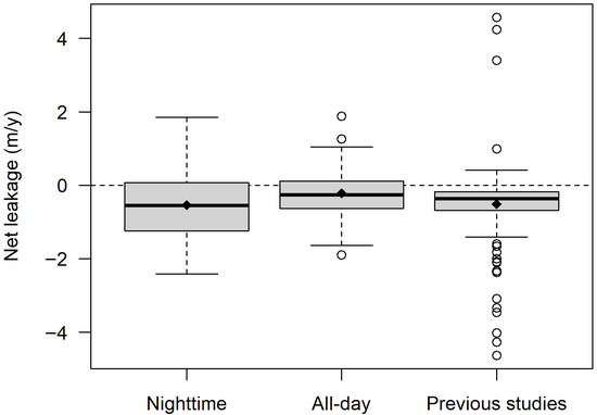 Boxplots of annual lake leakage estimates from this study’s nighttime and all-day applications of the modified White method (n = 28 lakes) and from previous studies (n = 138 lakes). Means shown as diamonds.