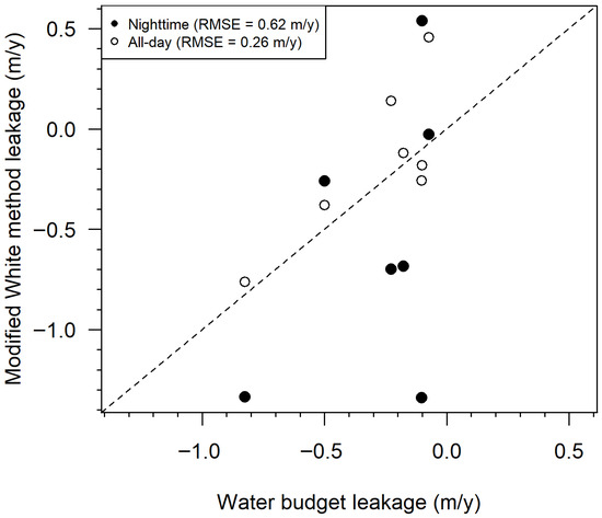 Scatterplot comparing annual leakage estimates from previous water budget studies and this study’s applications of the modified White method (n = 7 lakes).