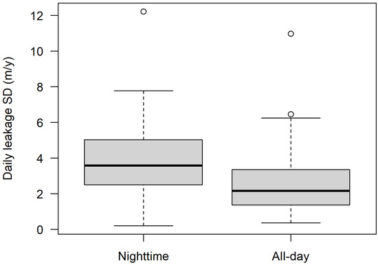 Boxplots of standard deviations (SD) of daily leakage estimates from nighttime and all-day evaluations using the modified White method (n = 28 lakes).