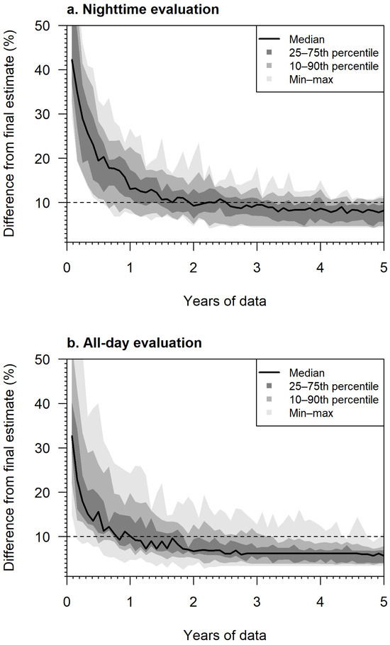 Convergence analysis of 14 lakes with sufficient data showed leakage estimates converged to within 10% of the final estimate for only 8 lakes for the nighttime evaluation and 9 lakes for the all-day evaluation, with 5 lakes common between them. For the nighttime evaluation, the median number of years required ranged from 0.6 to 4.5 y (median of 1.9 y) (Figure 7a). For the all-day evaluation, the median number of years required ranged from 0.2 to 4.4 y (median of 0.8 y) (Figure 7b). The time to converge was not significantly correlated to the standard deviation of daily estimates or to number of filtered days of data available for either group (p > 0.10 for all tests), although the tests have low statistical power.