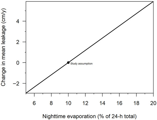 For the nighttime evaluation, sensitivity to the nighttime evaporation fraction was tested by varying the nighttime fraction of 24 h evaporation from 5% to 20% in 1 percentage point increments. The resulting change in mean annual leakage estimates, relative to the 10% value utilized in the study, was then calculated.