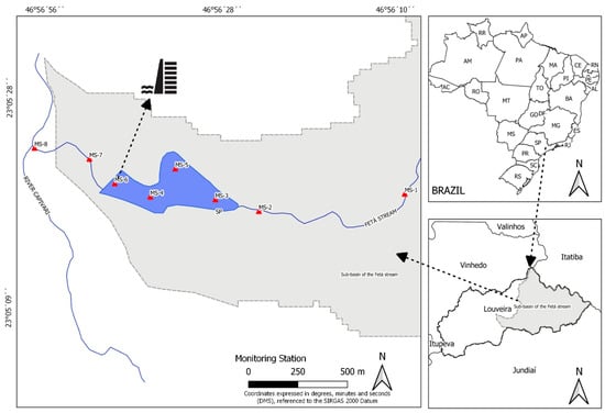 Location of the Fetá stream and distribution of monitoring stations upstream, downstream and in the artificial reservoir.