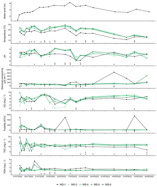 Temporal variation in Fetá Reservoir’s surface water physicochemical properties and nutrient concentrations after closing the floodgates. MS-1 (in black) corresponds to the monitoring station in the lotic stretch upstream of the reservoir’s zone of influence. The other monitoring stations (MS-3 to MS-6, in green) are inside the reservoir. In all cases, significant differences between MS-1 and the other stations in a Student’s t-test on each sampling date are represented by * (p < 0.5) and ** (p < 0.01).