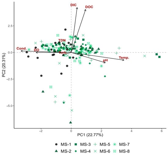 Principal Component Analysis for surface water quality variables upstream (MS-1, MS-2), downstream (MS-7, MS-8) and within (MS-3,4,5 and 6) the Fetá Reservoir throughout the sampling period.