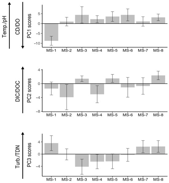 Scores of Principal Components 1, 2 and 3 at monitoring stations upstream (MS-1, EM2), downstream (MS-7, MS-8) and within (MS-3, MS-4, MS-5 and MS-6) the Fetá stream reservoir throughout the sampling period. Arrows to the left of the y-axis represent variables with highest loadings in each principal component, and their direction of change.