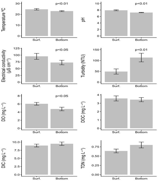 Comparison of physicochemical variables and nutrient concentrations in the water at the surface and bottom of the Fetá Reservoir. Bars represent the mean ± 1 standard error of the monitoring stations inside the reservoir (MS-3, MS-4, MS-5 and MS-6), on the 21 sampling dates that comprise the environmental monitoring. Only significant differences are represented.