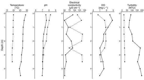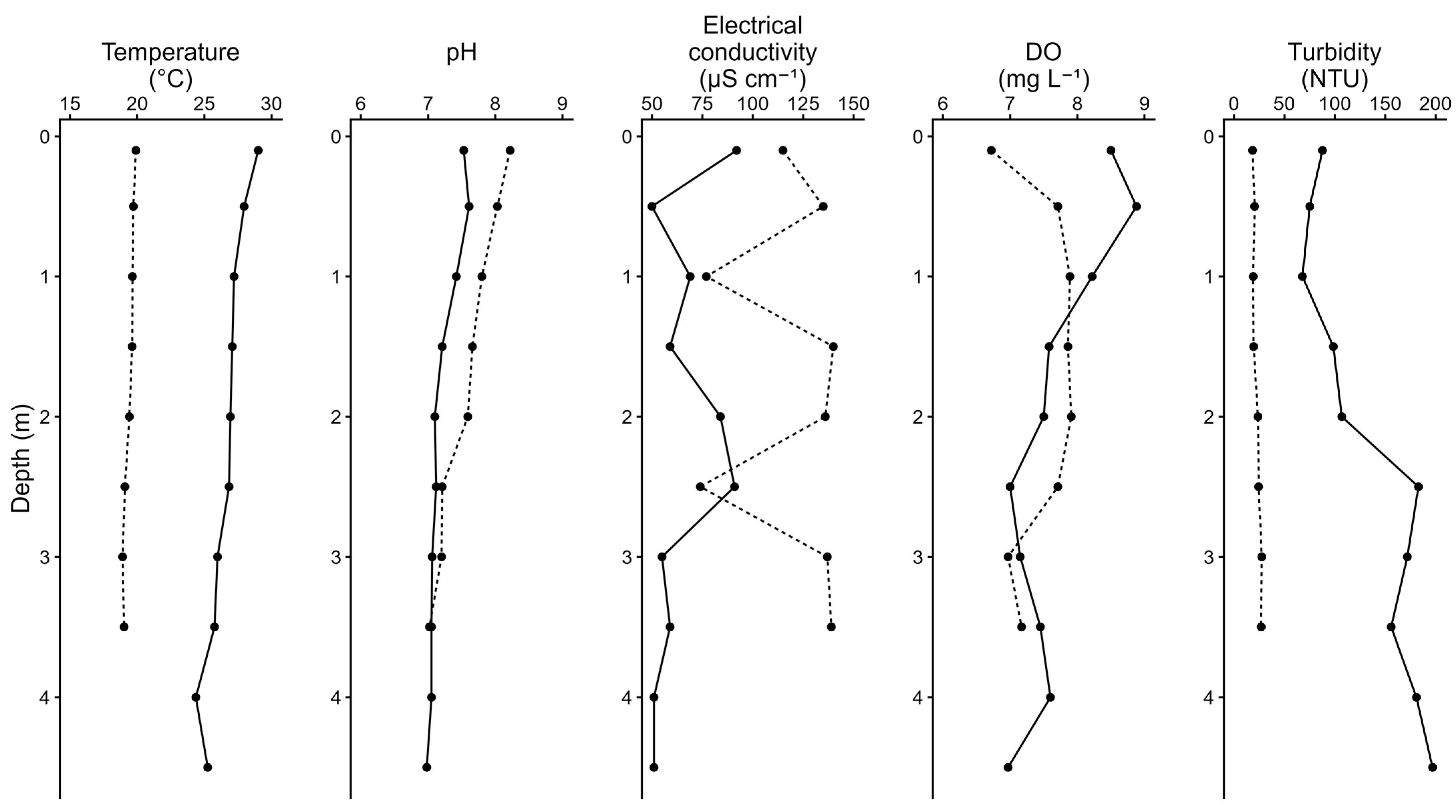 Water quality varied consistently with water depth (Figure 5). Temperature, pH, conductivity and dissolved oxygen were highest at the surface, whereas turbidity was highest at the bottom. No significant effects of water depth were observed for dissolved organic carbon, dissolved inorganic carbon, total dissolved carbon and total dissolved nitrogen concentrations. Despite this wide range of significant effects of depth on water quality, vertical profiles in temperature and other water quality parameters indicate no sign of stratification (Figure 6).