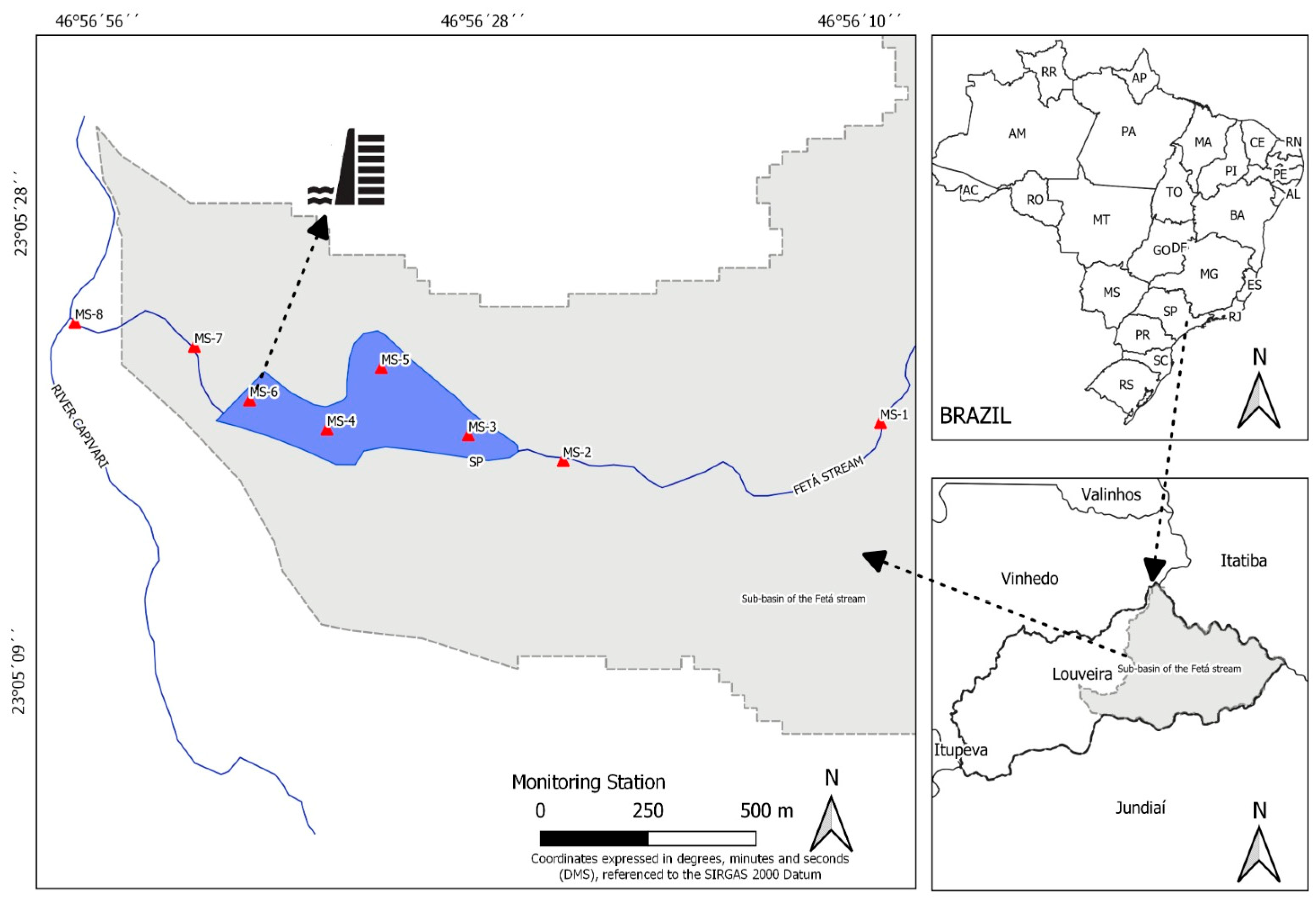 Figure 1. Location of the Fetá stream and distribution of monitoring stations upstream, downstream and in the artificial reservoir.