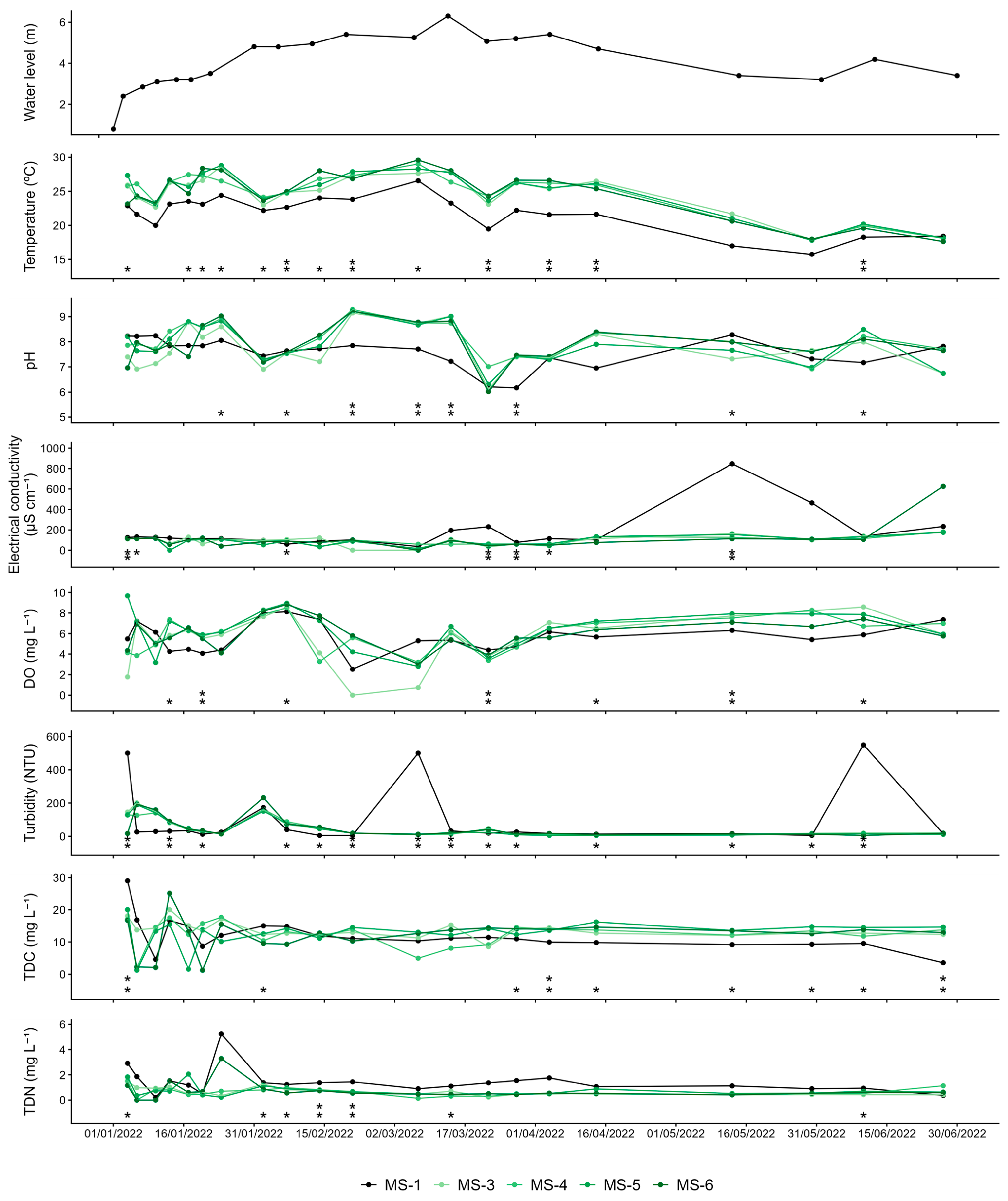 Figure 2. Temporal variation in Fetá Reservoir’s surface water physicochemical properties and nutrient concentrations after closing the floodgates. MS-1 (in black) corresponds to the monitoring station in the lotic stretch upstream of the reservoir’s zone of influence. The other monitoring stations (MS-3 to MS-6, in green) are inside the reservoir. In all cases, significant differences between MS-1 and the other stations in a Student’s t-test on each sampling date are represented by * (p < 0.5) and ** (p < 0.01).