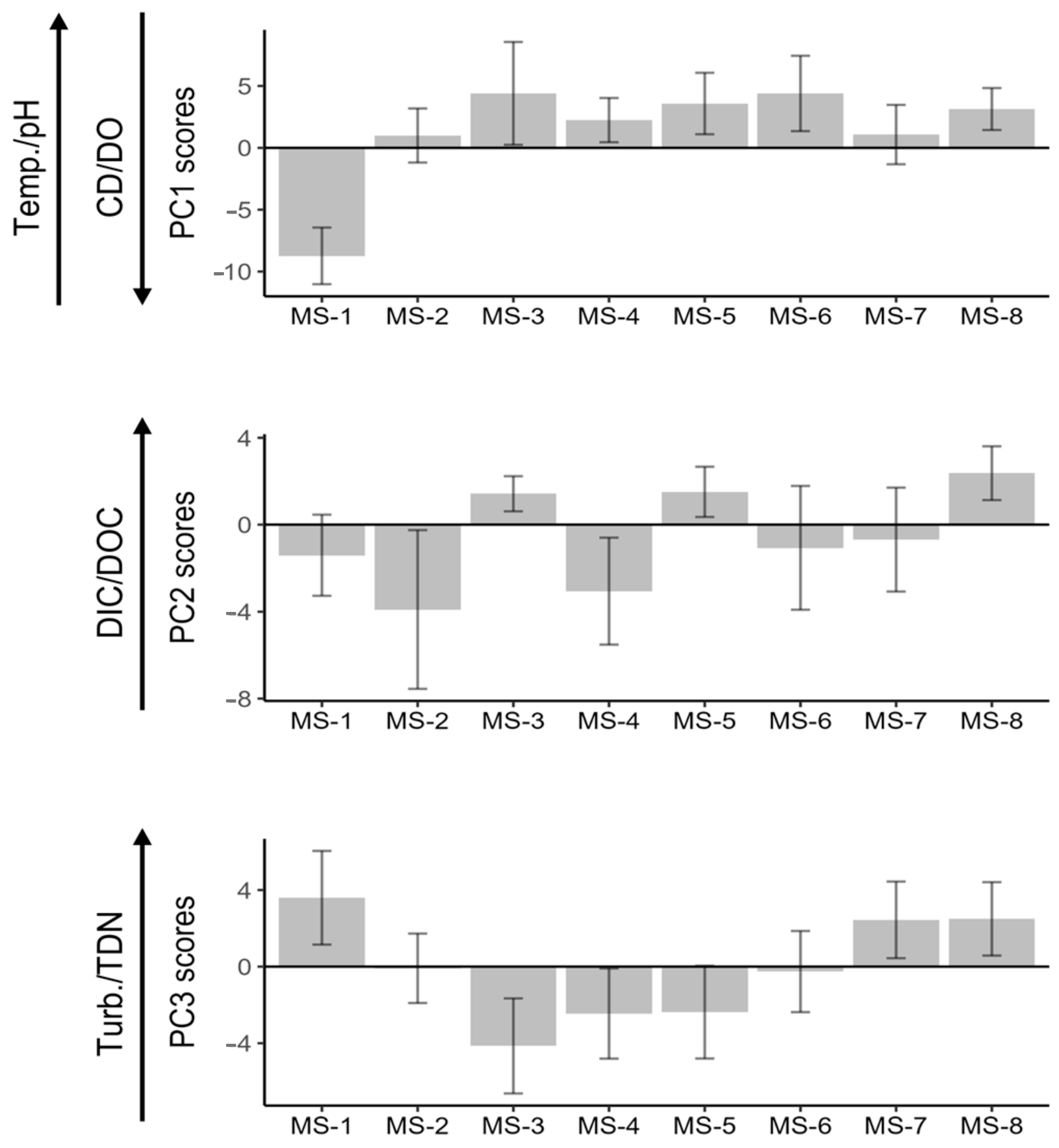 Figure 4. Scores of Principal Components 1, 2 and 3 at monitoring stations upstream (MS-1, EM2), downstream (MS-7, MS-8) and within (MS-3, MS-4, MS-5 and MS-6) the Fetá stream reservoir throughout the sampling period. Arrows to the left of the y-axis represent variables with highest loadings in each principal component, and their direction of change.