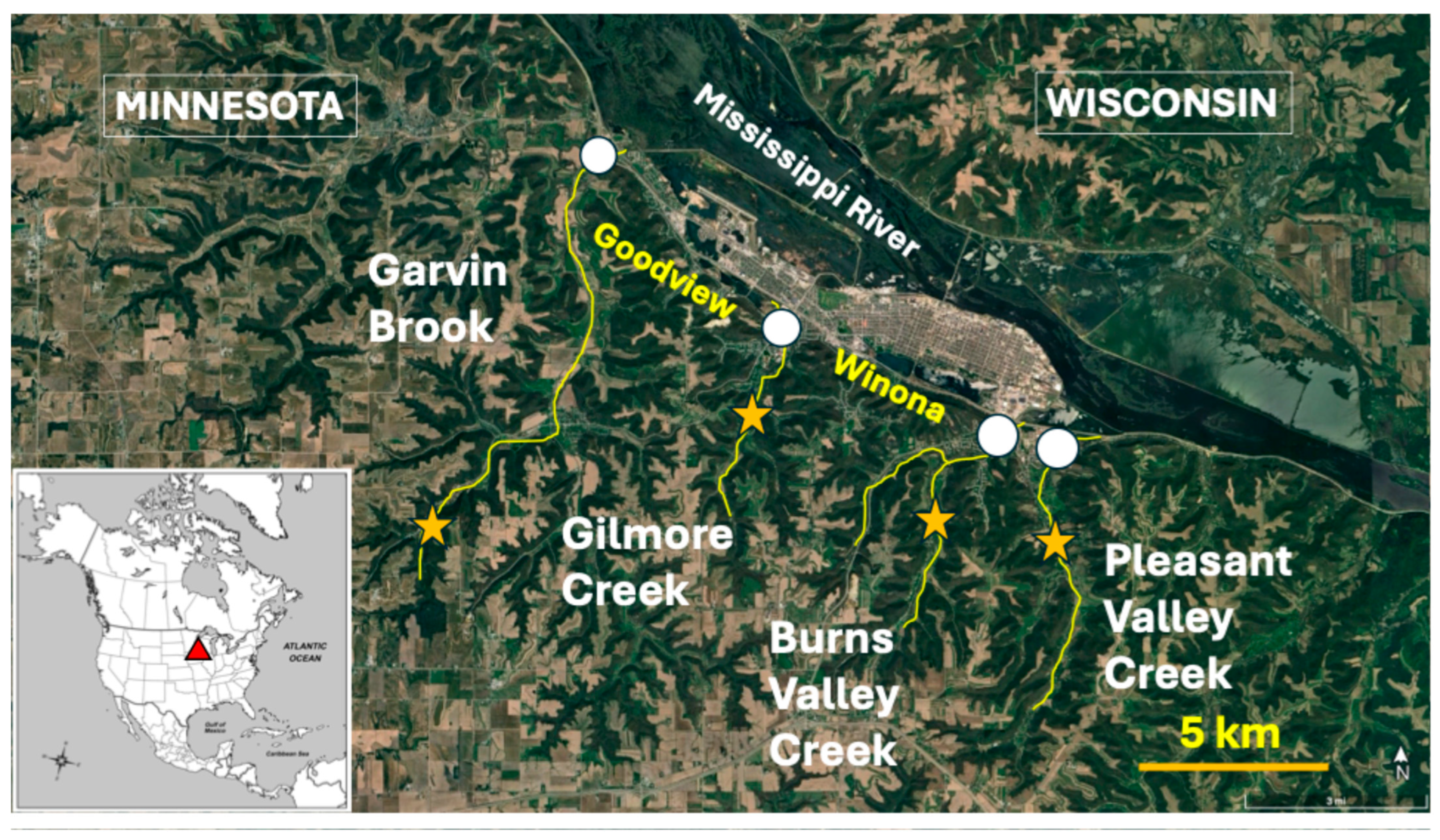 - Varela, W.L.; Mundahl, N.D.; Staples, D.F.; Bergen, S.; Cochran-Biederman, J.; Weaver, C.R.; Thoms, M.C. Groundwater springs influence fish community distribution and trout condition across a longitudinal gradient in a coldwater catchment in southeastern Minnesota, USA. Water 2024, 16, 1961. [Google Scholar] [CrossRef]