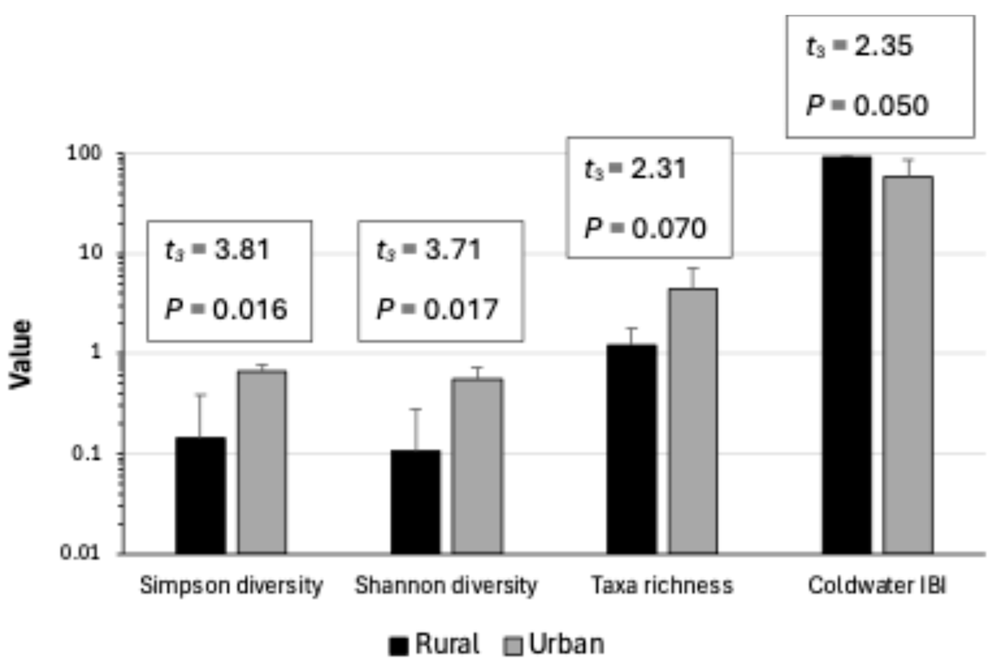 Mundahl, N.D. Do Urban Trout Streams Have Higher Fish Community Diversity and Taxa Richness but Reduced Biotic Integrity Compared to Their Rural Counterparts? A Pilot Study. Limnol. Rev. 2025, 25, 55. https://doi.org/10.3390/limnolrev25040055