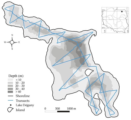 Lake Dejguny has a total area of 765.3 ha, a volume of 92.6 × 106 m3, a mean depth of 12.0 m, a maximum depth of 45.0 m, a maximum length of 6.5 km, and a maximum width of 2.4 km (Figure 1). It is located in the Masurian Lake District (northeastern Poland). The shape of the lake basin allows for the distinction of three parts: the northwestern part (with a maximum depth of 29 m), which is separated by a not-so-narrow isthmus, the central part (with a maximum depth of 45 m), and the southeastern part of the lake (with a maximum depth of >30 m). This reservoir was identified by Witold Białokoz in 2010 as one of the most valuable natural lake ecosystems, having undergone “the least negative changes to date,” retaining “its mesotrophic character,” and the lake “holds promise for the maintenance or eventual restoration of its natural habitats”. This lake was “fishing-oriented, focused on managing a strong vendace population based on stocking and harvesting.”