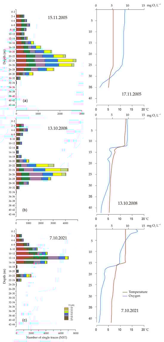 Target strength (TS) distribution in 2 m-thick layers and oxygen and temperature profiles in Lake Dejguny on (a) November 2005, (b) October 2008, and (c) October 2021 (data after [16,28]).