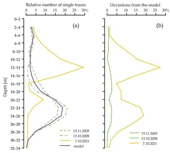 Distribution of relative number of single traces (%) in 2 m-thick layers in Lake Dejguny on 15 November 2005, 13 October 2008, and 7 October 2021 (a) and the distribution of shape deviations (Δ) of these profiles from the model (b).