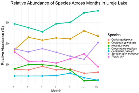 Monthly trends in terms of relative abundance are given in Figure 2. The Kruskal–Wallis test for monthly relative abundance of fish species in Ureje Lake showed no significant temporal variation. The chi squared value was 0.46043 with 6 degrees of freedom and the p value was 0.9983, indicating that the distribution of species abundance remained stable throughout the sampling months.