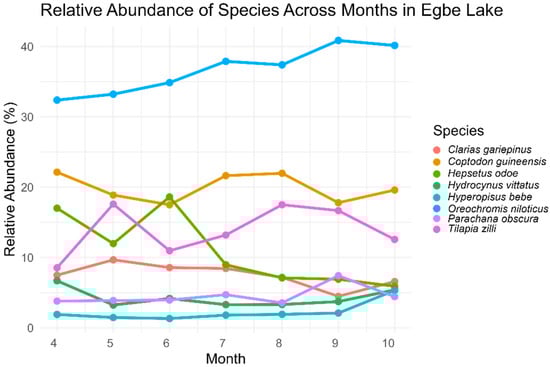 A total of 11,157 fish were recorded from Egbe Lake, comprising eight species across six families, namely Cichlidae, Clariidae, Alestidae, Hepsetidae, Channidae, and Mormyridae (Table 4). The species identified were Oreochromis niloticus (Linnaeus, 1758), Tilapia zilli (Gervais, 1848), Coptodon guineensis (Günther, 1862), Hepsetus odoe (Bloch, 1794), Hydrocynus vittatus (Castelnau, 1861), Clarias gariepinus (Burchell, 1822), Parachanna obscura (Günther, 1862), and Hyperopisus bebe (Lacepède, 1803). O. niloticus had the highest relative abundance at 32.86%, while H. bebe had the lowest at 2.78%.