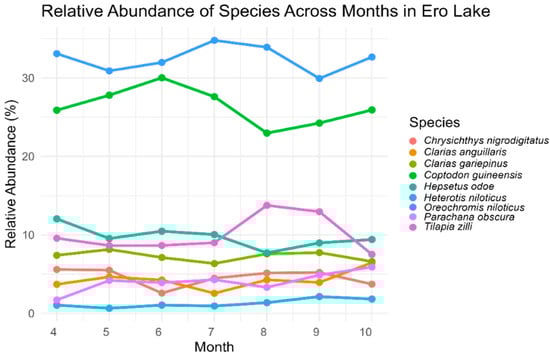 The Kruskal–Wallis test for monthly relative abundance in Ero Lake indicated no statistically significant variation across months (p > 0.05). This shows that the observed monthly differences (Figure 4) were not meaningful, and species abundance remained consistent throughout the study period.