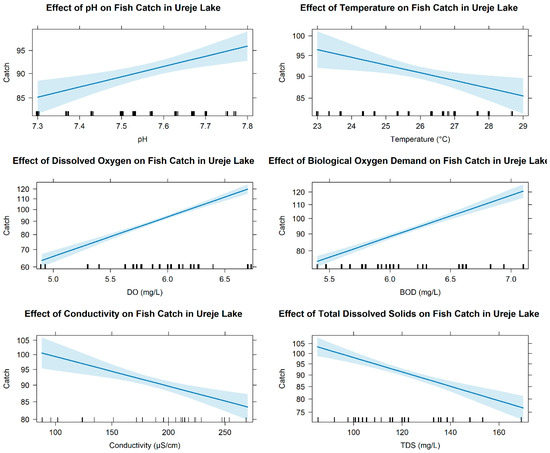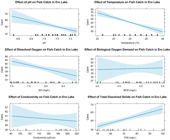 The generalized linear model for Ero Lake (Figure 7) showed negative coefficients for pH, temperature, and dissolved oxygen in relation to fish catch. Conductivity and biochemical oxygen demand showed minimal negative coefficients. Total dissolved solids had a positive coefficient, indicating higher catch at higher TDS levels.