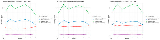 The following supporting information can be downloaded at: https://www.mdpi.com/article/10.3390/limnolrev26010002/s1, Table S1: Monthly diversity indices of Ureje Lake, Table S2: Monthly diversity indices of Egbe Lake; Table S3: Monthly diversity indices of Ero Lake; Table S4: MANOVA results for Diversity Indices across the three sites; Table S5: Summary of MANOVA results with each Index across the three sites; Table S6: Tukey test to separate means for Margalef Diversity Index amongst the three study sites.