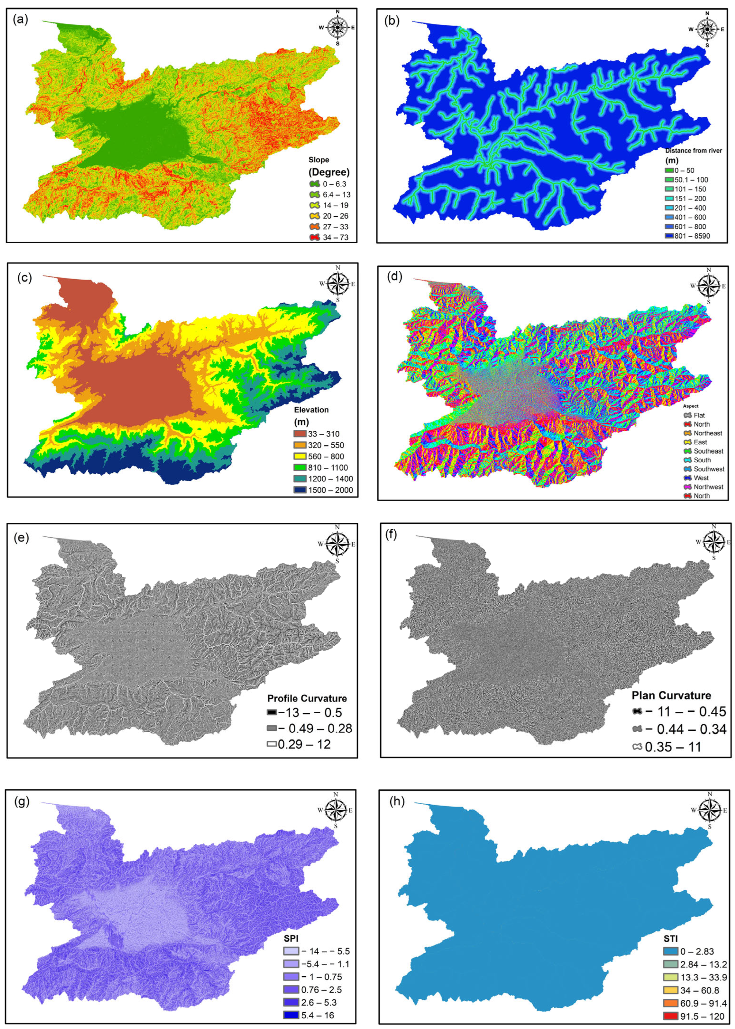 | Digital elevation model (dem) | Raster | Alos Palsar DEM (https://search.asf.alaska.edu/, accessed on 16 February 2024) | 12.5 × 12.5 m | Elevation, Slope, Aspect, Plan curvature, Profile curvature, TWI, SPI, STI |