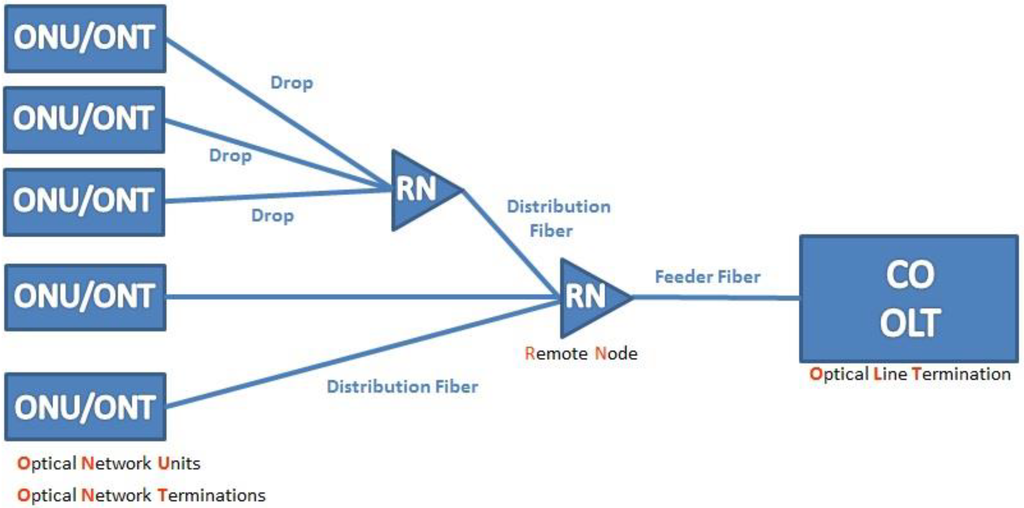 In Figure 2 an extremely simplified PON architecture is depicted, which could be referred to any PON solution. According to terminology adopted since ITU-T G.983 standard, a generic PON tree is constituted by an optical line termination (OLT) placed in the CO and providing network-side interface of the OAN which, connected through ODN to N optical network units (ONUs), provides the user-side interface. In the case of FTTH networks, each ONU is coincident with an optical network termination (ONT), because it includes the user port function. The ODN can include a certain number of splitting stages (typically one or two) placed in RNs (remote node). The components located in a RN have generally multiplexing and de-multiplexing functions, so they could be power splitters or more complex devices, but still rigorously “passive”, with the meaning illustrated in the previous paragraph. RN could be the ideal place where an optical amplifier in LR-PONs can be installed. The RNs split the ODN in two or more fiber spans: feeder fiber is the one next to the CO; distribution fiber is the one exiting each port of the first splitting stage; drops are the optical link reaching each single users and is generally included in vertical cabling inside buildings.