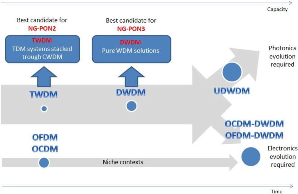 In the roadmap defined by the FSAN group, describing the evolution of OANs in the next years, XG-PON has already been selected as the best candidate for NG-PON1 solutions, i.e., the next generation PONs. The following step will be represented by NG-PON2 solutions whose system requirements have already been standardized by ITU-T G.989.1 in 2013. NG-PON2 must support at least 40 Gb/s aggregate downstream capacity and more than 10 Gb/s in the upstream direction, with 40 km maximum passive fiber reach and up to 60 km by eventually using reach extenders, with more than 64 end-users connected by these networks. Moreover, NG-PON2 solutions should ensure compatibility with legacy systems GPON and XG-PON and with existing ODNs, saving long-lived infrastructure investments [13].