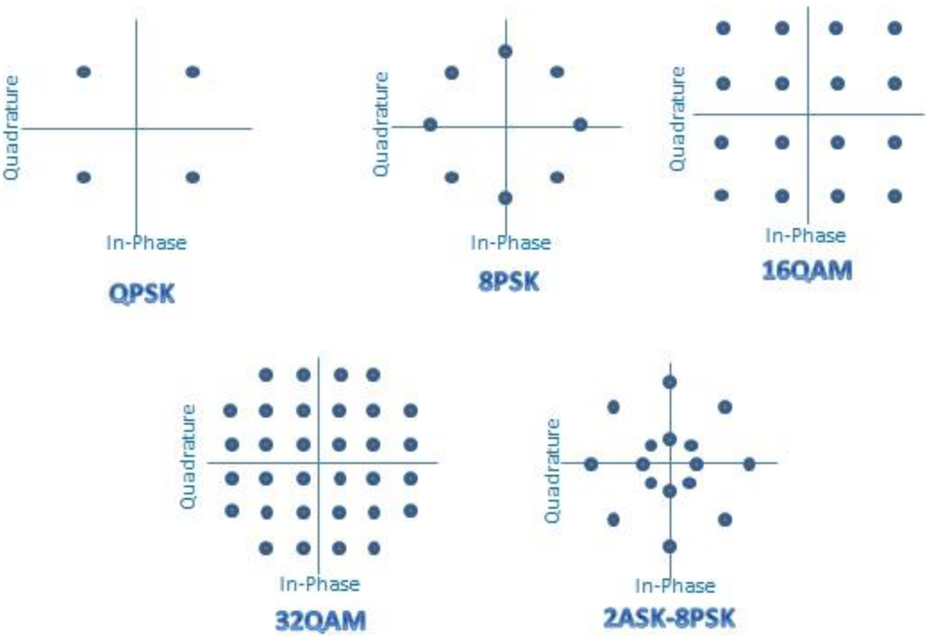 M-ary amplitude shift keying (M-ASK), M-ary phase shift keying (M-PSK) and M-ary amplitude phase shift keying (M-APSK) have been proposed. Some constellation diagrams are depicted in Figure 5. In particular M-APSK can obtain an optimal distribution of symbols in the complex plane in terms of transmitted power minimizing. Rectangular constellation diagrams (i.e., quadrature amplitude modulation, QAM) or concentric ring constellation diagrams can be implemented. The k-th symbol in M-APSK constellation is described as follows: