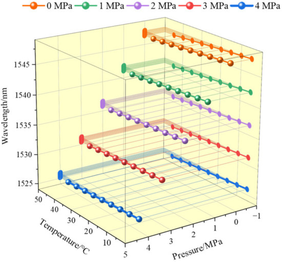 It can be seen from Figure 4 that under different temperatures, the same pressure changes correspond to basically the same wavelength changes, and under different pressures, the same temperature changes also correspond to basically the same wavelength changes. Therefore, the influence of temperature and pressure on the wavelength can be separated; that is, the wavelength of the sensor can be expressed as follows: