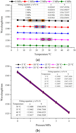 To clearly illustrate the effect of temperature and pressure on wavelength, the data in Figure 3 are redrawn in two separate plots, as shown in Figure 4. Figure 4a shows the influence of temperature on wavelength under different pressures and lists the linear fitting equation of the temperature-wavelength relationship. It can be seen from Figure 4a that the slope of the five fitting curves is not 0, which indicates that the temperature has an impact on the wavelength. At the same time, the slope of the five fitting curves is very similar, indicating that under different pressures, the changes in the wavelength caused by the same temperature change are almost identical. Figure 4b shows the influence of pressure on the wavelength at different temperatures, that is, the response of the sensor. Similar to Figure 4a, the slope of the fitting curve is very close, indicating that the influence of pressure on the wavelength is almost the same at different temperatures.