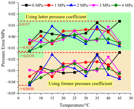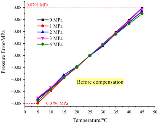 After processing the data shown in Figure 4 according to the method in this paper, the compensated pressure value is calculated, and then the set value of the pressure source is subtracted to obtain the test error, as shown in Figure 6. The maximum error occurs at the temperature of 5 °C and the pressure of 1 MPa, and the maximum error is −0.0152 MPa. Compared with the error of −0.0796 MPa before temperature compensation, the error after compensation is significantly reduced.