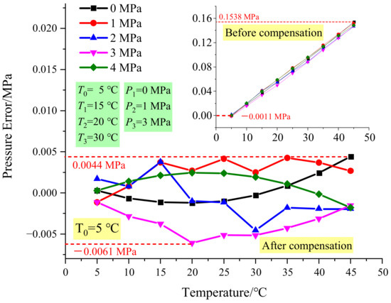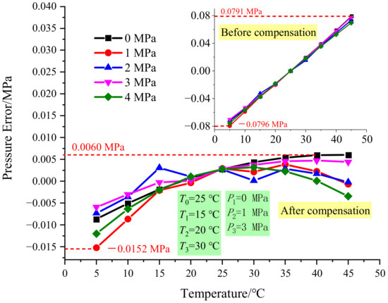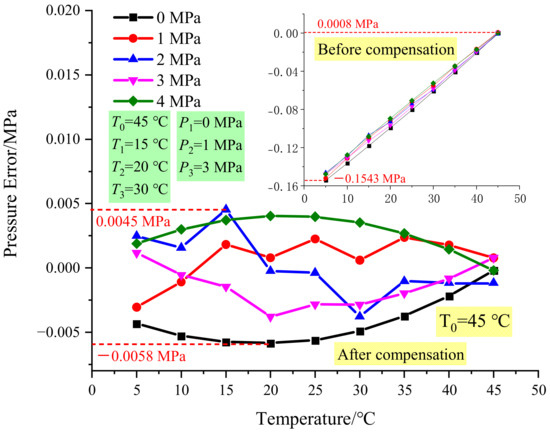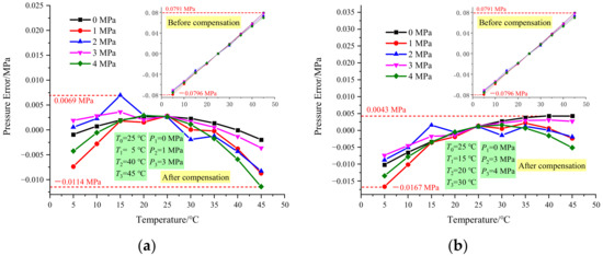 First, the pressure data are kept the same as in Figure 6, which is 0 MPa, 1 MPa, and 3 MPa, and the temperature data are changed to 5 °C, 40 °C, and 45 °C. Figure 9a shows the results, and it shows that the maximum error is −0.0114 MPa. Then the temperature data are kept the same as in Figure 6, which is 15 °C, 20 °C, and 30 °C, and the pressure data are changed to 0 Mpa, 3 Mpa, and 4 MPa to compare the temperature compensation effect. Figure 9b shows the results, and the maximum error is −0.0167 MPa.