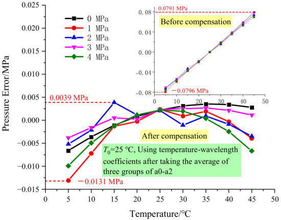 The temperature-wavelength coefficients () obtained from a group of data are used for the above temperature compensation. Next, the temperature wavelength coefficients averaged by multiple groups () are used for temperature compensation to study the compensation effect. The converted target temperature in lines 2, 4, and 5 of Table 1 is 25 °C, so the corresponding () of these three groups of data are selected for average processing, and then temperature compensation is calculated. The compensated results are shown in Figure 10. It can be seen from Figure 10 that when the averaged temperature-wavelength coefficients are used for temperature compensation, the maximum error is −0.0131 MPa, and the accuracy is 0.33%. Table 1 shows that the errors obtained without averaging are −0.0152 MPa, −0.0114 MPa, and −0.0167 Mpa, respectively, and the corresponding accuracies are 0.38%, 0.29%, and 0.42%, respectively. It can be seen that when the averaged temperature-wavelength coefficients are used for compensation, the accuracy is better than the results of two of them and slightly worse than the highest accuracy, indicating that the averaged coefficients are better for temperature compensation.