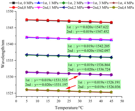 In Equation (4), represents the initial wavelength when the pressure is and the temperature is . and represents the wavelength change caused by pressure and the wavelength change caused by temperature respectively.