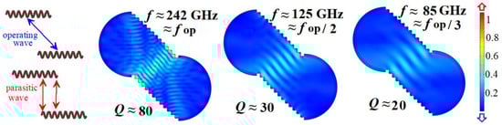 Modes with other frequencies can exist only due to operating this system as an ordinary Fabry–Perot cavity. Figure 3 illustrates operating such a cavity at three frequencies, namely, at a frequency close to the target one ( 250 GHz), as well as near the 2nd sub-harmonic and the 3rd sub-harmonic ( and , respectively). The latter two cases correspond to the excitation of the parasitic waves at the fundamental cyclotron resonance in 250 GHz gyrotrons operating at the second and third cyclotron harmonics, respectively. In all these three cases, the Q-factors of parasitic modes are very small (more specifically, two orders of magnitude lower than the Q-factor of the operating wave). Thus, we can state that the system shown in Figure 2 supports high-Q transverse modes only in a relatively narrow frequency range close to (this fact is illustrated schematically in Figure 1f). More detailed calculations of the properties of these eigenmodes are given in the next Section 3.