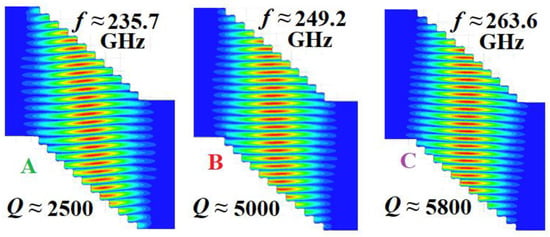 Eigenmodes with different numbers of field variations between the corrugated mirrors and their Q-factors in the case of the distance between the corrugated mirrors h = h0 = 10 mm. The modes A, B, and C are described by curves A, B, and C in Figure 5.