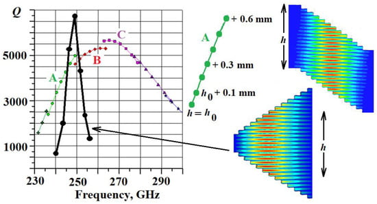 As a result of these calculations, Figure 5 illustrates eigenfrequencies and the Q-factors of different modes of this system at different distances h between the corrugated mirrors. Here, the extreme left points on curves A, B, and C (describing Q-factors and frequencies of eigenmodes in the case of h = h0 = 10 mm) correspond to the modes A, B, and C in Figure 4. At any fixed distance h between the mirrors, we see a set of different modes spaced relative to each other by a frequency close to 14 GHz. They have different Q-factors, and at any fixed distance h only three of them have relatively high Q-factors. For instance, at h = h0 these are modes B, C, and D (their Q-factors vary from 4500 up to 5500), whereas the Q-factor of mode A shown in Figure 4 is significantly lower (2500). However, if we increase the distance up to h = h0 + 0.6 mm (the extreme right points on different curves), then the “main” modes are A, B, and C, whereas the Q-factor of mode D is less than 3000.