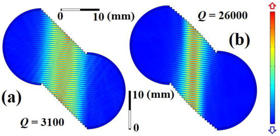 If we increase twice both transverse sizes of the system (the distance between the mirrors h and the length of the corrugated mirrors) at the fixed operating frequency (fixed parameters of the corrugation), then the Q-factor decreases by a factor of 2 (Figure 7a). At the same time, the use of corrugated mirrors having a parabolic form (instead of planar mirrors) can increase the Q-factor by the order of magnitude due to the focusing properties of such mirrors (Figure 7b). One more advantage of such a focusing system is reducing the effective transverse size of the wave beam inside the cavity. As a result, this effect increases the factor of coupling between the cavity eigenmode and the operating electron beam of a gyrotron realized on the basis of such a cavity (see Section 5).