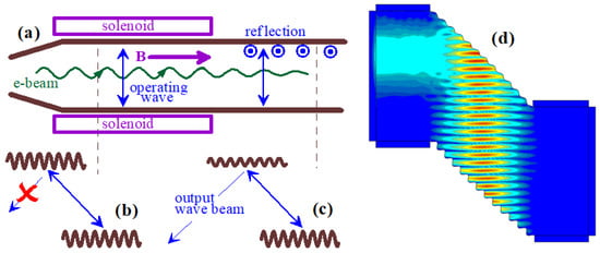 (a) Schematic of the gyrotron with the wave output system. (b) Transverse cross-section of the operating cavity. (c) Transverse cross-section of the system of formation of the output wave beam. (d) Simulations of the planar system of formation of the output wave beam, where a not deep enough upper grating radiates a traveling wave in the left direction.