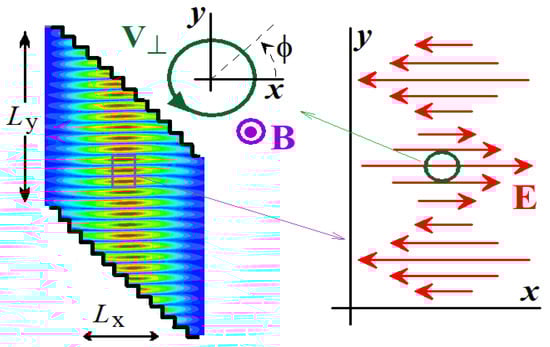 Here, is the point of the center of the electron orbit, is the gyro-rotation phase, and is the gyro-radius. Thus, Equation (5) is re-written as follows: