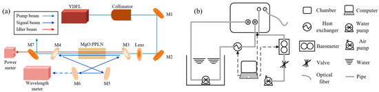 The experimental setup used was almost identical to the setups described previously [10,11,20]. As shown in Figure 1a, the seed source (EYP-DFB-1064, eagleyard Photonics GmbH, Berlin, Germany) with a ~2 MHz linewidth was a commercially available distributed feedback laser (DFB). The pump source was a linear-polarized cw Yb-doped fiber laser (YDFL) delivering a maximum of 23 W power at 1064.024 nm a with beam quality factor M2 < 1.1. The MgO:PPLN, as the nonlinear crystal, had dimensions of 50 × 10 × 1 mm3 and ten grating-periods ranging from 27.6 μm to 31.6 μm across its lateral dimension. Both the end faces of the crystal were antireflection-coated (T > 99%) at 1064 nm, 1400–2100 nm, and 2200–4400 nm. Two sapphire flakes were used to sandwich the crystal for even heating. They were housed in an oven with a stability of ±0.01 °C and mounted on a linear translation stage. M1,2 were highly reflecting at 1064 nm for an 45° angle of incidence. The ring cavity comprised two concave mirrors, M3,4 (the radius of curvature was −100 mm), and two plate mirrors, M5,6. The mirrors, M3–5, were highly reflecting (R > 99.8%) for the signal (1300–2100 nm), while M4, as the output coupler for the signal, was highly reflecting (R > 99.8%) for the ranges 1300–1600 nm and 1800–2100 nm, but had an output coupling of ~0.5% across 1600–1800 nm. In addition, M3–6 were highly transmitting (T > 99.5%) for the idler and pump. According to the length of the SRO cavity, the theoretical waist radius of the signal mode at the center of the crystal was estimated to be ~75 μm [30]. To match the mode of the signal beam, the pump beam, outputting through the fiber collimator, was focused to a spot with a waist of ~80 μm using a plano-concave lens. M7, as a dichroic mirror, was used to separate the output idler from the residual pump and leaking signal. The idler power and signal wavelength were monitored using a power meter (S425C, Thorlabs, Inc., New Jersey, United States) and a wavelength meter (WS6, HighFinesse GmbH, Tübingen, Germany), respectively. The shield of the SRO, i.e., an aluminum chamber with dimensions of 350 × 240 × 123 mm3, was used to erase disturbances in the air currents. As shown in Figure 1b, the base plate temperature of the chamber was stabilized within ±0.01 °C through water cooling equipped with a heat exchanger. The air pump sucked the air out through the valve, and the barometer recorded the air pressure in the chamber. The vent, the windows for the output laser, and the cover plate were all sealed with collar seals.