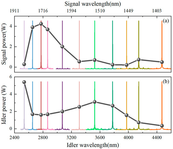 Figure 3 shows the spectrum of the output beam measured using a Fourier transform optical spectrum analyzer (OSA207, Thorlabs, Inc., New Jersey, United States). The solid curves were divided into eleven groups according to their color, with each group representing an idler spectrum and a corresponding signal spectrum. The dashed curve in Figure 3 shows the maximum output power of the extracted signal and idler across the tuning range when the pump power was ~23 W. As seen in Figure 3a, the signal power at the near wavelength of 1600 nm and 1800 nm sloped steeply due to the coating of M4. However, the corresponding idler power with beam quality factor M2 < 1.5, shown in Figure 3b, exhibited the opposite trend. The idler power of the wavelength beyond 4000 nm plummeted because material absorption became significant [21,31]. Over the whole tuning range, SRO could provide >200 mW of signal power with up to 4.2 W at a wavelength of 1726 nm, and >300 mW of idler power with up to 5.4 W at a wavelength of 2534 nm.