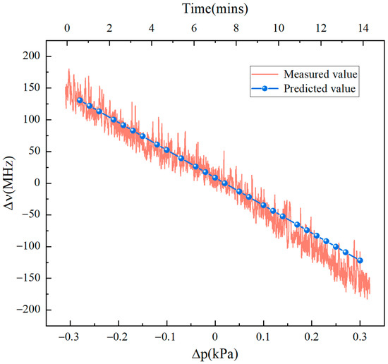 By substituting the appropriate values of T (292.15 K), Z (0.9996), (1.000286), (380 mm), (2.14), (50 mm), and (205.31521 THz), the frequency shift can be predicted by measuring the air pressure variation ∆p, which is shown as a dash–dot line in Figure 4. To validate the theoretical results, the aluminum chamber was evacuated. Then, we slowly injected air into it and constantly measured the air pressure and signal frequency. As seen in Figure 4, the frequency shift decreased from +155 MHz to −168 MHz over the air pressure variation range from −0.3 kPa to +0.3 kPa (the reference point of the pressure was 94.815 kPa), which was well in agreement with the predicted values. The frequency decreased at a rate of ~22 MHz/min, but fluctuated continually because of the air current.