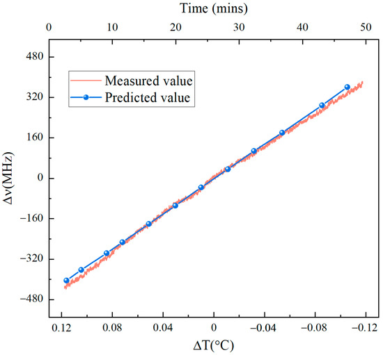 By measuring the temperature change and substituting it into Equation (7), the predicted values of the frequency shift from the center frequency of 191.31109 THz can be obtained. The results shown in Figure 5 are proportional to the temperature change. The solid line of Figure 5 shows that the measured frequency increased linearly with the temperature decrease when the aluminum chamber dissipated heat from 34.42 °C to 34.18 °C. Compared with the measured frequency in Figure 4, the violent fluctuation of the frequency could be controlled effectively using the airtight aluminum chamber.