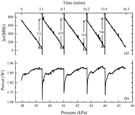 The frequency no longer shifts linearly but suddenly switches to another frequency if the change in external influences, such as air pressure, is great enough. As shown in Figure 6a, the air pressure in the aluminum chamber gradually increased from 37.9 kPa to 45.5 kPa, which provoked a series of mode hops that varied like a sawtooth curve. The parallel dash lines indicate the ending of the previous mode and the beginning of the next mode, respectively. The distance between them indicates the frequency deviation in the two adjacent modes. Figure 6b shows the corresponding output power of idler while modulating mode hops. The idler power increased slowly to ~1.92 W with a frequency decrease but sharply reduced to minimum power while the cavity mode was hopping. Both the frequency drift of the signal and the idler power curves retraced their steps after each signal mode hop.