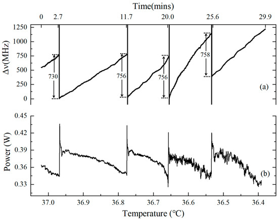 Specifically, the experimentally observed power drop was ~0.08 W, shown in Figure 7, between two modes, which resulted in a frequency shift increment of as small as 130 MHz, corresponding to the temperature decrement of ~0.15 °C. If power increases, as shown in Figure 6, the deviation in power will cause a blue-shift, so the modes hop at