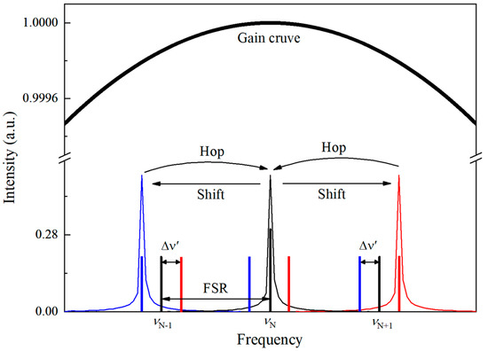 According to Equation (1), the FSR of the SRO is ~620 MHz, which is much smaller than the spacing of the mode hops we measured in Figure 6 and Figure 7. We believe this is caused by the jump in signal and idler power at mode-hopping, which causes crystal refractive index variation through the laser heating effect. The mechanism for this is illustrated schematically in Figure 8. The broad curve and vertical lines indicate the parametric gain curve associated with QPM and longitudinal cavity modes related to the optical length, respectively. In the ideal case, the frequency closest to the center of the gain curve is dominant over all other frequencies and will eventually oscillate. The decrease in the base plate temperature impels the frequency shift to while not shifting the gain maximum until the frequency has a higher gain and starts to oscillate. Compared to the initial state, however, the deviation in power ∆P can cause the temperature of the crystal along the optical path to shift slightly, and so does the refractive index of the crystal Thus, the oscillating cavity mode will hop back to the initial state until the frequency shifts to (To distinguish the frequency shift mentioned in Figure 4, Figure 5, Figure 6 and Figure 7, represents the extra frequency shift.) The deviation in frequency obtained from Equation (1) is