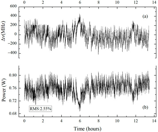 To characterize the performance of the SRO, we examined the long-term stability of the signal frequency at 1511.814 nm and the corresponding idler power under free-running conditions for a pump power of ~15 W. As can be seen in Figure 9, the SRO was capable of operating without mode hops over 13 h after stabilization of the temperature of the crystal and base plate. However, its frequency fluctuated periodically because of the influence of the air conditioner. Specifically, the deviation in the signal frequency was ± 400 MHz and the root meat square (RMS) of the idler power was 2.55%. To further improve the frequency and power stability, it is necessary to avoid air temperature changes caused by air conditioning. Similar to the results in Figure 6 and Figure 7, the signal frequency and idler power trends were opposite.