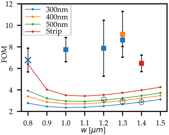 Comparison between the simulated (circular points connected by continuous lines) and the experimentally retrieved for the investigated structures (squares). The are obtained from the simulated and measured and presented in Figure 4. Error bars are ±σ. The colors of the simulation and experimental points are consistent: blue (g = 300 nm), orange (g = 400 nm), and red (strip waveguide). The experimental values of the strip waveguide are taken from Reference [14]. The point at w = 0.8 µm, marked as a cross, is taken from Reference [24] and describes a structure produced with identical fabrication processes but on a different wafer lot. The three black circles mark three exemplary geometries with the same pitch.