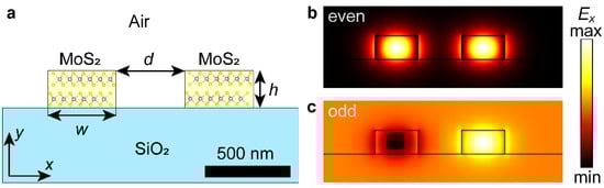 We start with the analysis of a typical structure (Figure 1), consisting of a pair of MoS2 waveguides, placed on top of a silicon oxide substrate. To make waveguides operate in a single-mode regime, we chose the following waveguide dimensions, which support only the fundamental transverse electric (TE) mode (height h = 220 nm, width w = 400 nm) and set the gap between waveguides to d = 400 nm. The relations between the dimension, effective refractive index and difference in effective indices of supermodes are collected in Figure A1 in the Appendix A section. Additionally, we noticed that anisotropy aids in the suppression of all modes except TE, giving anisotropic materials an unexpected advantage because the single-mode regime is preferable to prevent undesired losses and multimode interference [35]. The reason for that is a nonzero projection of the electric field perpendicular to MoS2 layers, where the refractive index is relatively small (n ~ 2.5) for waveguide modes apart from fundamental TE mode. Conversely, fundamental TE mode has an electric field along MoS2 layers, where the refractive index is large (n ~ 4.0).